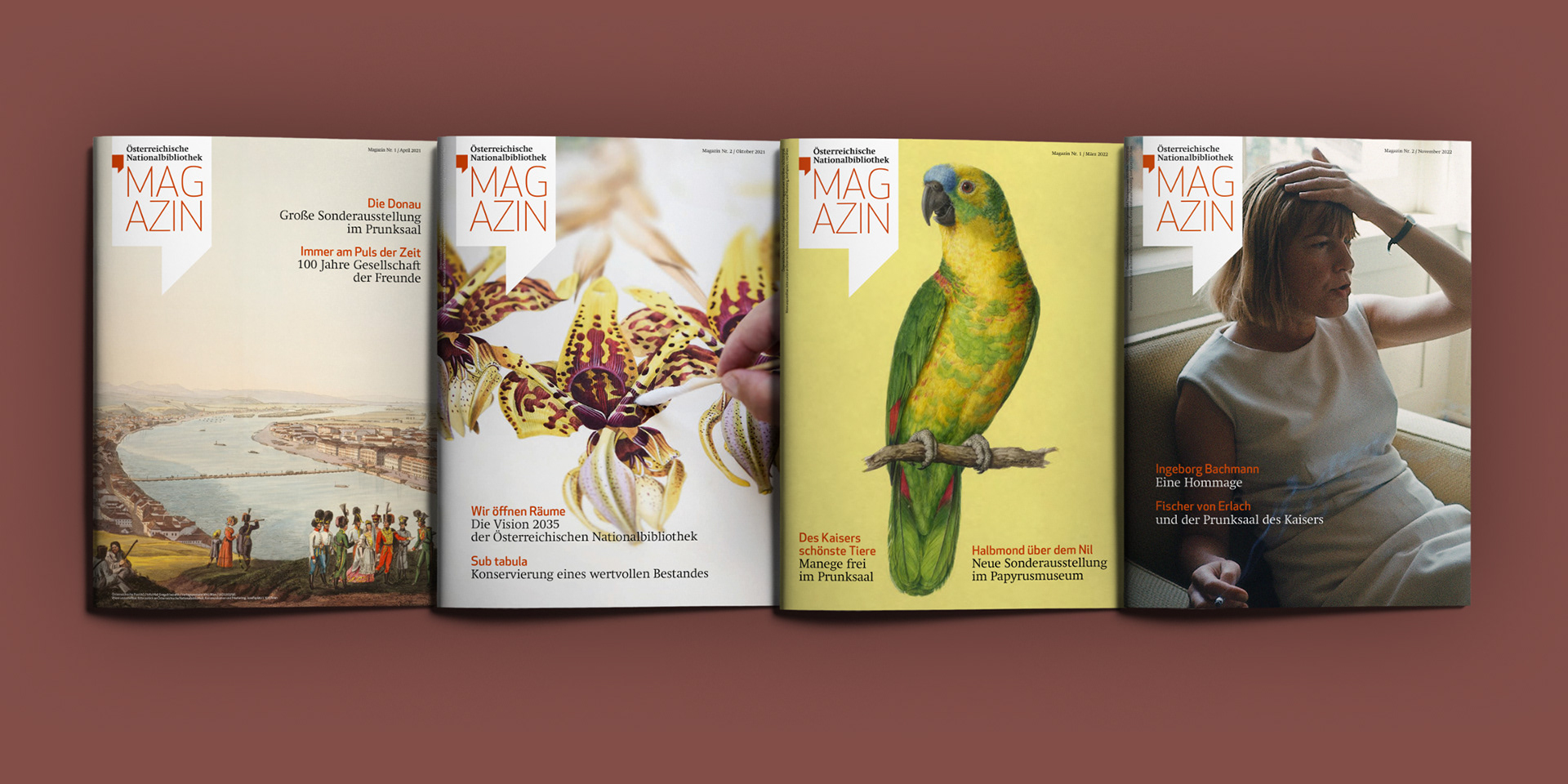 Prunksaal, Museen, Sonderausstellungen, historische Sammlungen, Archive, Bibliothek und vielfältige digitale Angebote: Das Grafikdesign für die ÖNB vermittelt zwischen kulturellem Erbe und moderner Informationsgesellschaft. 2019–2022 / Print Design / Editorial Design für ein bestehendes Branding